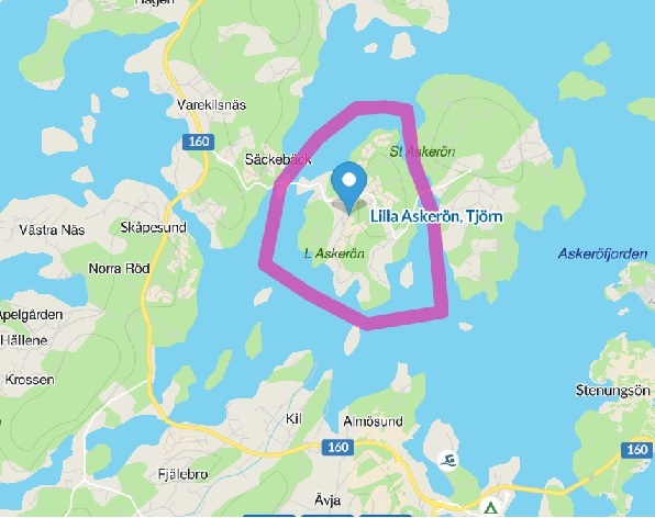 Strax efter släktgårdarna i Varekilsnäs, innan Skåpesundsbron, tar vi av västerut mot Askeröarna. Lilla Askerön hör till Valla socken och nu Tjörns kommun, för innan vägen drogs över sundet var enklaste sättet att ta sig hit med båt.