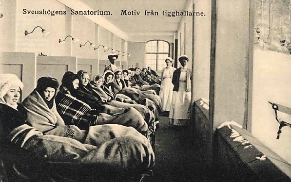 Många låg här i dödens käftar. Så den morbida humorn kunde diskuteras, särskilt som tuberklerna dödade Olles moster på sanatoriet. Det var på trettiotalet. Hennes femåriga dotter var också inlagd men visste inte om att mamman fanns där. Tills hon satt med en sjuksyster i en korridor och fick se mamman på långt håll. Nej, det är inte din mamma sa systern. Jag kände igen henne på koftan sa dottern senare. Om sjukhuset väggar kunde berätta skulle många hårda livsöden komma i dagen.