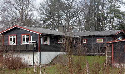 Forna rånbageriet huset med brutna taket till vänster. Mot söder syns vid badplatsen Uggletången, fornborgen där mästertjuven Lasse-Maja sägs ha gömt tjuvgods.
