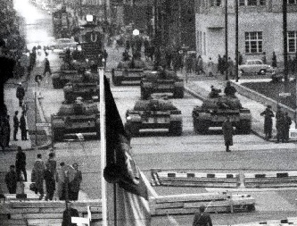 När han passerat vita gränslinjen stoppar två ryska stridsvagnar honom och i backspegeln ser han sig inkilad av amerikanska tanks. Efter en lång palaver backade de ryska vagnarna och han kunde fortsätta. I det lilla i en kraftmätning som så när hotade världsfreden.