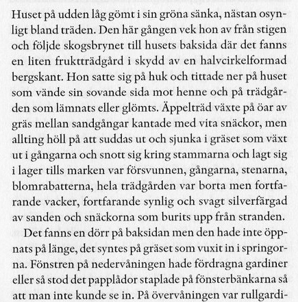 “Malott (Maria Charlotta) var ett ljus, som ljuset tänt mitt i en kulturisolerad brännvinsdal. Vindpinade och karga var de grå tjurskallebergen som på båda sidor begränsade den långa och bördiga men knappt kilometerbreda dalen,utefter vars kanter gårdarna låg radade med jämna avstånd. Oh människorna som bodde där hade formats av naturen, av granitbergens vildhet och svartlerans tyngd, till ett släkte av ruvare men läggning för fanatism som, om den väcktes åt något bestämt håll, flammade upp, hednastark, hårdnackad och svår att kuva”. Barnatro.