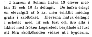 Bland 13 flickor i en kurs var det ingen, som visste, att nypon kunde användas i hushållet, nässlor ansågos duga endast som föda åt grisar och höns. Men nu kokades nässelkål, som blef omtyckt af de flesta. Af rabarber kokades kräm och soppa, sylt och saft. Blåbär, vinbär och krusbär torkades, och de två senare användes i soppor och kakor i st. f. russin och korinter”.