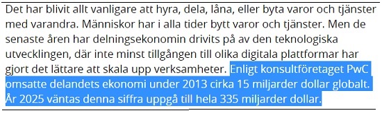 Ett framtidsscenario 2026. Från 15 miljarder dollar 2013 till 335 år 2025 enligt spåmännen på PWC. Prognosen för delningsekonomin globalt tycktes slå in. I Sverige samma trend. Regeringen fick eld i baken och kom med en utredning, SOU 2017:26 Delningsekonomi.