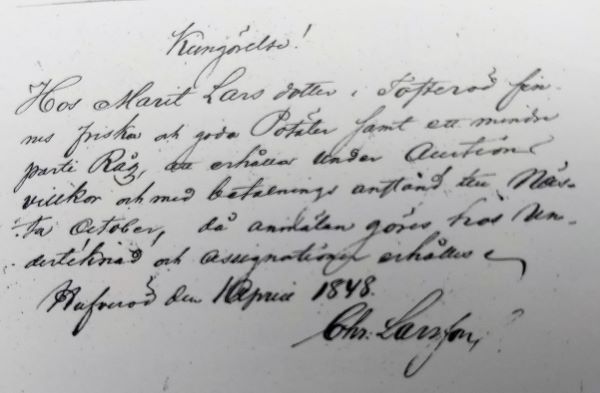 På 1800-talet läste Ucklumprästen från predikstolen kungörelser, även med reklam för bygdens varor och tjänster. Det kunde handla om tröskverk, hästkastrering eller som här potäter och råg från Marit Larsdotter i Tåsteröd. Affären gjordes upp med ett handslag på kyrkbacken.