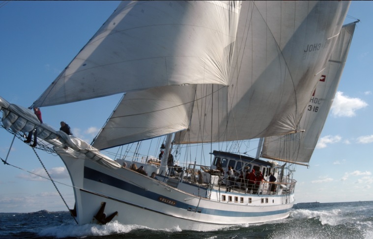Magnus Rassy tittar storögt på denna Elida V, en ketch byggd i glasfiber på SwedeShip Composite i Hunnebostrand. 30 personer ryms i hytterna och dubbelt så många får plats på dagsresor. Vinden fyller seglet på 45 meter höga masten. Tack vare lätta glasfibern är Elida så snabb att hon utmanar tävlingsbåtar.