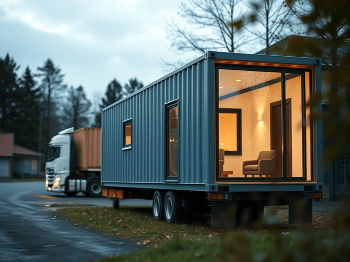 Problemet löstes med regionens Madeleine-byar. Patientens containerhus lyfts på en lastbil för att parkeras i Madeleineparken utanför sjukhuset NÄL.