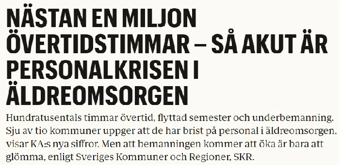 Antalet 80+ ökade från en halvmiljon till 800 tusen på 2020-talet, med fler dementa och svårt sjuka. Ökningen krävde 35 tusen fler undersköterskor i hemtjänsten. Utöver de 40 tusen som behövdes för att ersätta alla som gick i pension. Dessutom behövdes 10 tusen fler sjuksköterskor och dubbelt så många vårdbiträden. Ekvationen gick inte ihop, och äldrevården kollapsade.