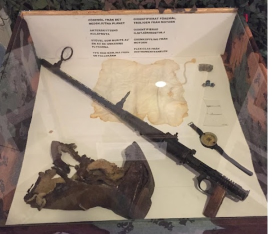 Planet vänder vid Fröland (dagen varvsområde), passerar centrum igen och drar på sig verkanseld från Boforskanonerna. Det brinner och störtar vid Dalslandsvägen (väg 172). Om denna redogörelse stämmer är upp till läsaren att avgöra.