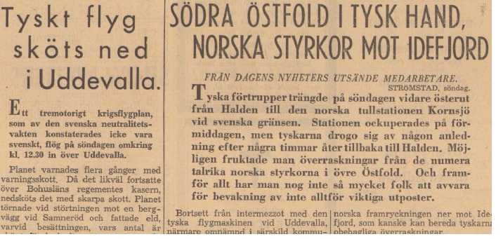 Luftvärntroppen på Musikberget höll högsta beredskap efter fler flygplan. Samma dag hade en Junker 52 landsatt fallskärmsjägare i Gudbrandsdalen. Planet nödlandade sedan i Lur norr om Grebbestad.