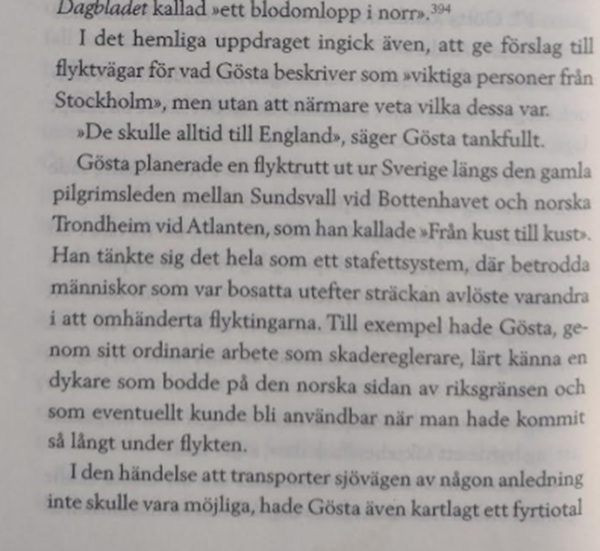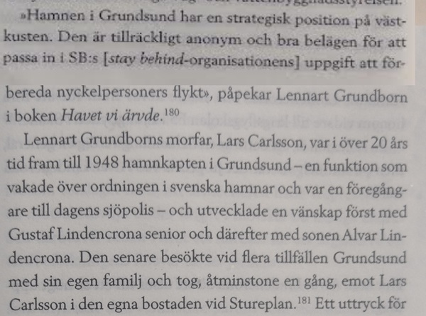 Citat ur boken: ”Hamnen i Grundsund har en strategisk position på västkusten. Tillräckligt anonym och bra belägen för att passa in i SBs (stay behind-organisationens) uppgift att förbereda nyckelperonsers flykt.