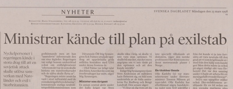 Citatet är hämtat från nykomna boken Sveriges sak är vår. Där författaren Johan Wennström berättar hur chefen för ett försäkringsbolag i Stockholm, Alvar Lindenkrona, organiserade en hemlig motståndsrörelse utifall ryssen invaderade. CIA bidrog till sådan Stay Behind i Europa, fast här för närmast invigda dold bakom namnet Erlanders kommite. För det var statsministernsom på en handskriven lapp gav Ehrenkrona order att i största hemliget organisera verksamheten.