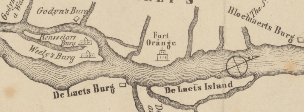 Låt oss från historiska fragment med fantasins hjälp skönja livet på Laets Burg, vilket betyder gården i tallskogen. Det halmtäckta huset är byggt i tegel, som fartygen haft med som ballast. Andra hus är byggda av plank sågat i vindmöllan på höjden, där drängen Jacob Goyverttsen brukar hjälpa till. Vid stallet selar Rolf en av de fyra hästarna. På fältet nedanför slår Claes Claesz vetet. Korna och ett dussintal får betar vid flodkröken, som än i dag kallas Roelof Jansen Kill. <w> <p>