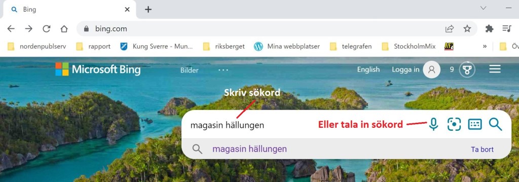 Skriv sökord för sökning på Internet. Eller klicka på mikrofonsymbolen och tala in sökningen.