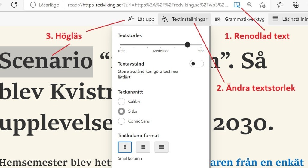 Se sökresultatet. Välj det du vill läsa. Gärna med rensad och förstorad text. Markera start för högläsning. Klicka på högläsningssymbolen.